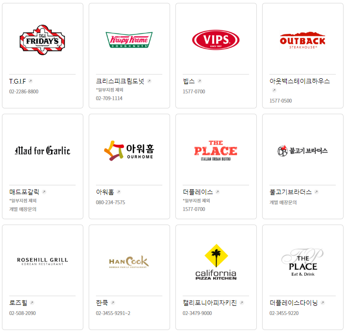 빕스, 아웃백스테이크하우스 등 제휴되어 있는 브랜드가 아주 많이 있습니다. 그러나 일부지점을 제외하는 경우도 있으니 개별 매장에 문의를 꼭 해보고 방문하세요.